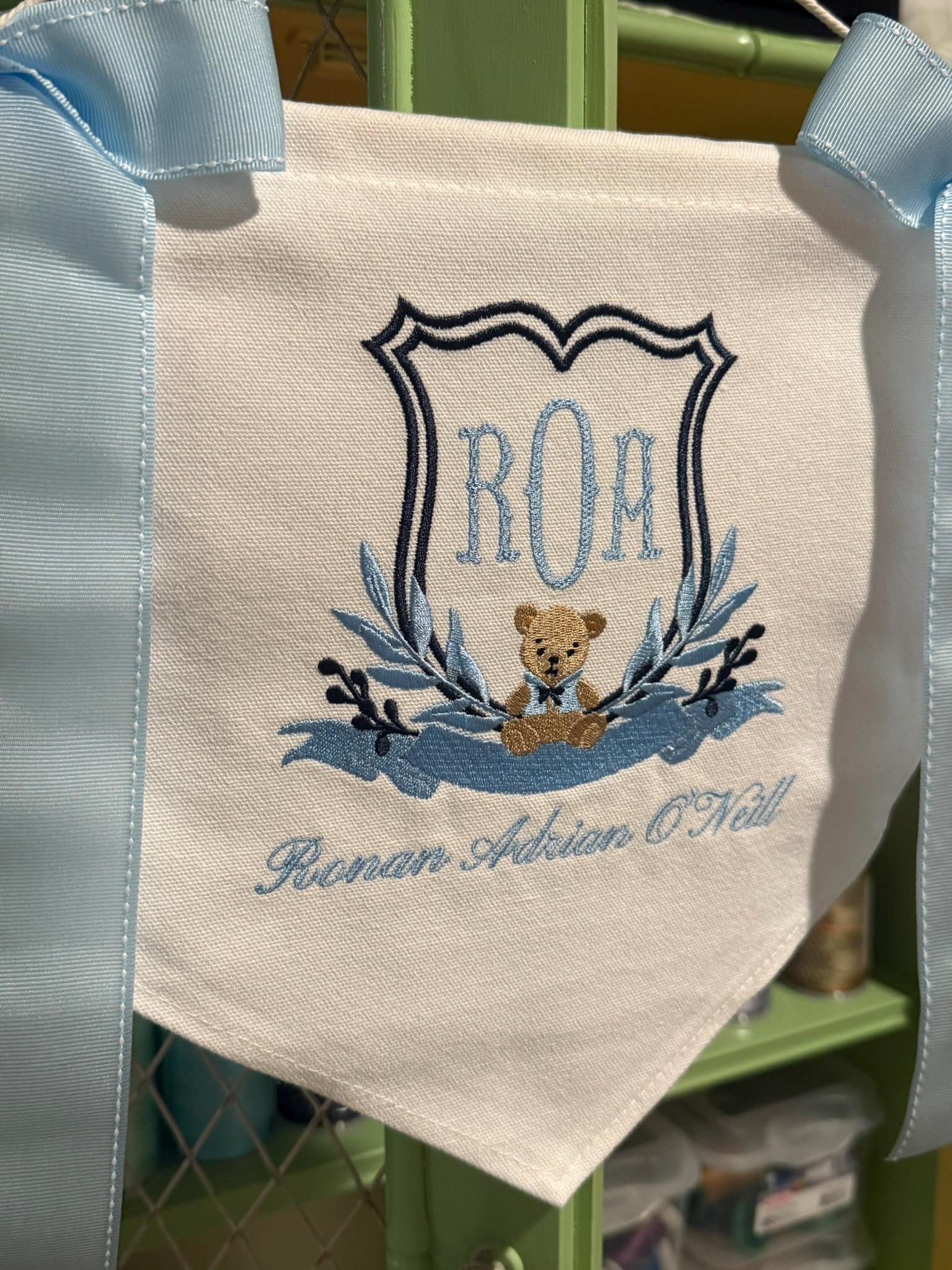 Personalized Baby Banner – Embroidered Name or Monogram with Crest, Bows – Hospital Door Sign, Nursery Decor, Baby Shower Gift