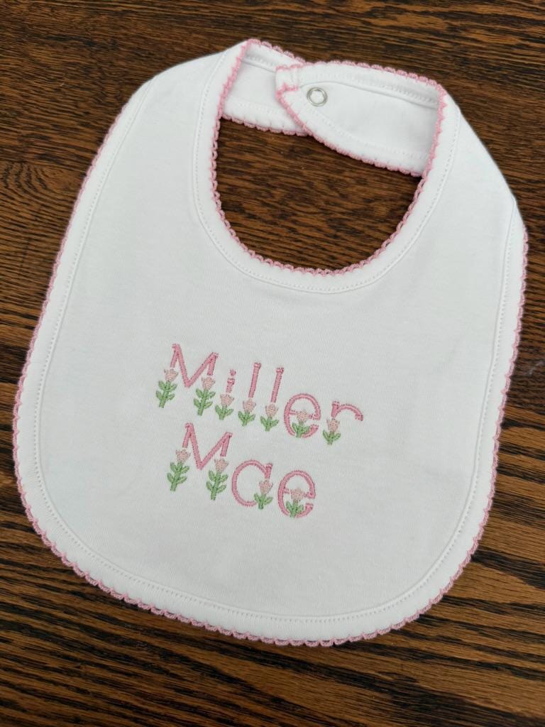 Add a sweet and personal touch to your little one’s essentials with these custom embroidered baby bibs and burp cloths, featuring a charming floral font. Available for purchase individually or as a coordinated gift set, these embroidered pieces are perfect for everyday use or as a thoughtful baby shower gift.