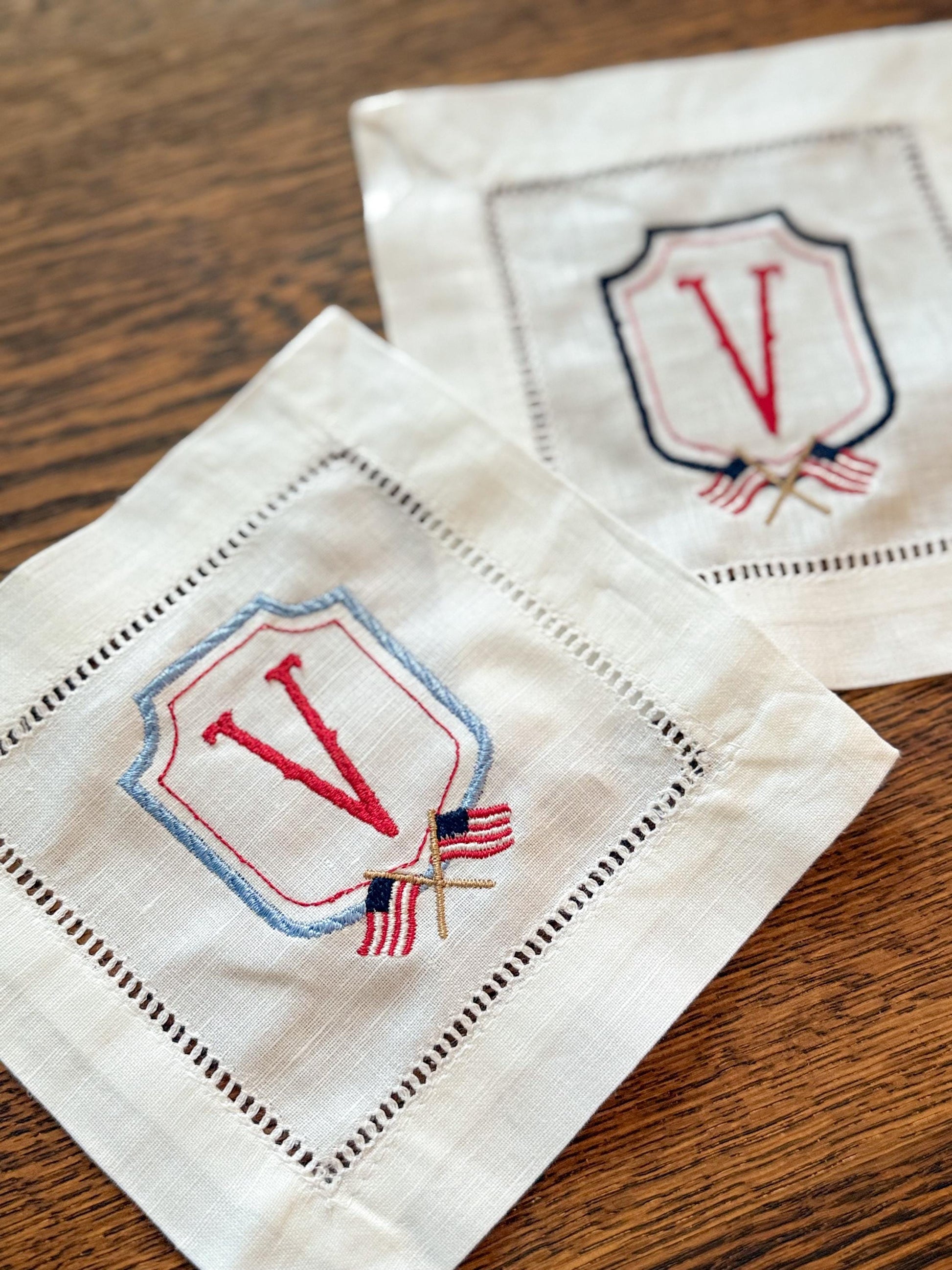 Celebrate patriotic holidays in personalized style with these monogrammed cocktail napkins, featuring a bold embroidered initial, shield frame, and crossed American flags. Perfect for 4th of July gatherings, Memorial Day parties, or summer celebrations, these linen napkins add classic Americana charm to your table! Add a personalized pop of patriotism to your next celebration with these classic and festive embroidered cocktail napkins!